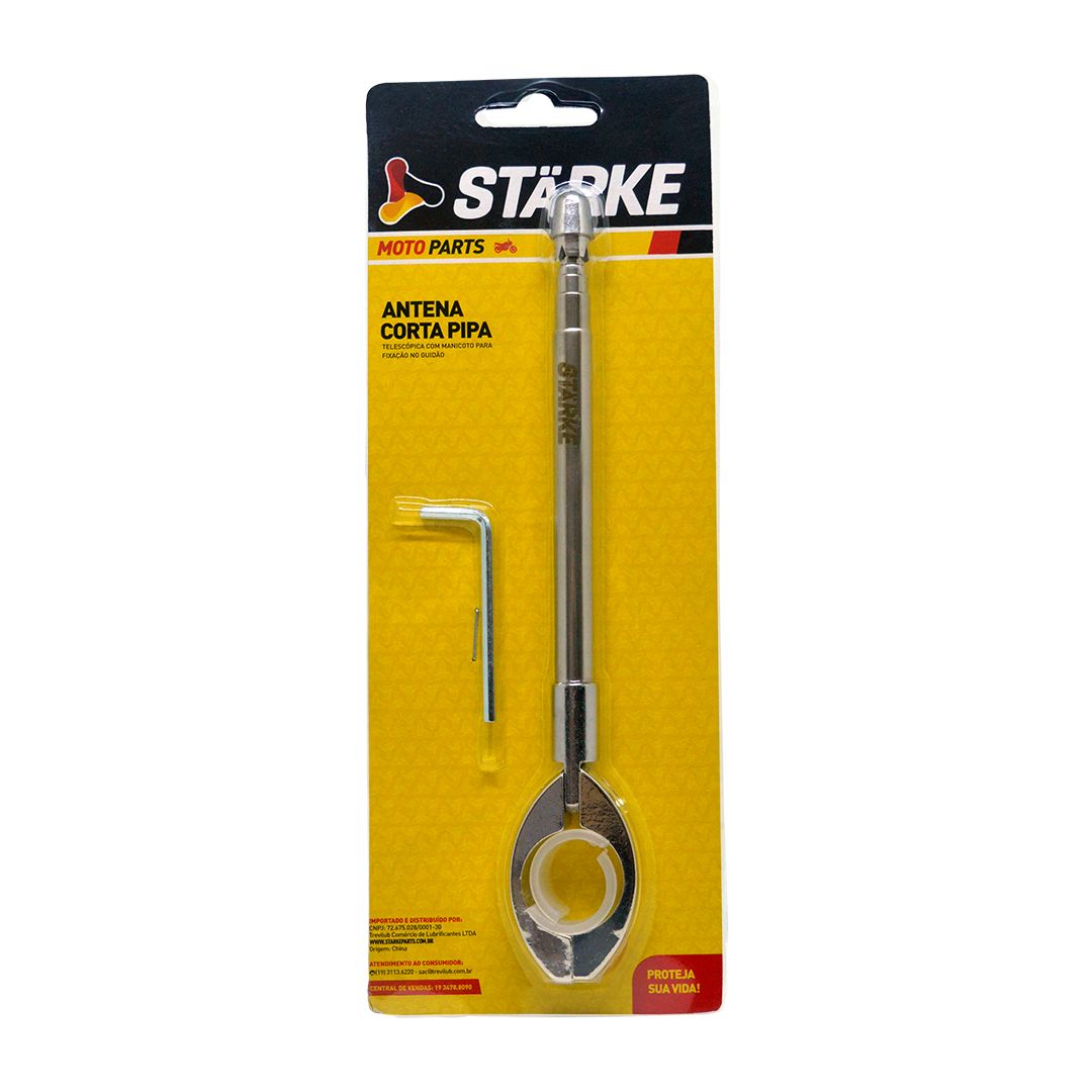Antena retrátil e dobrável com 7 estágios de regulagem de altura. Com a haste fabricada em aço inox e abraçadeira em alumínio, a Antena Corta-Pipa Stärke é ideal para segurança de todo motoboy ou motociclista.